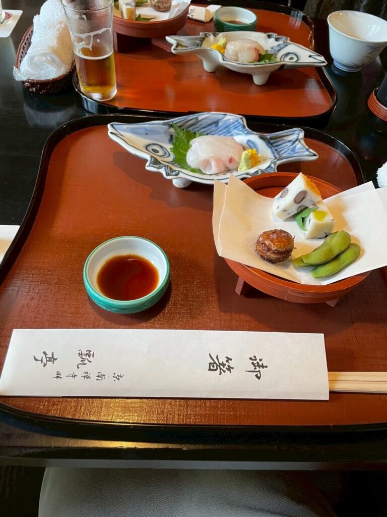 お食事は、あの有名なら老舗の瓢亭さんで、名物の瓢亭玉子や、鯛のお造りなど